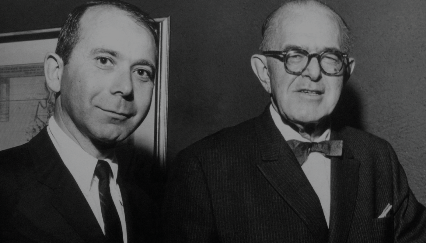 Maurice R. Greenberg, President of American Home Assurance Company (left), and Cornelius V. Starr, founder of the original Starr, celebrate Mr. Starr's 75th birthday in October 1967.