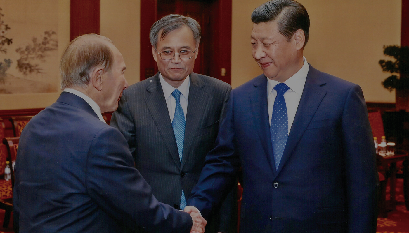 Maurice R. Greenberg with Xi Jinping, President of the People's Republic of China, and Chairman of the Central Military Commission, and Qian Yingyi Dean, School of Economics and Management, Tsinghua University.